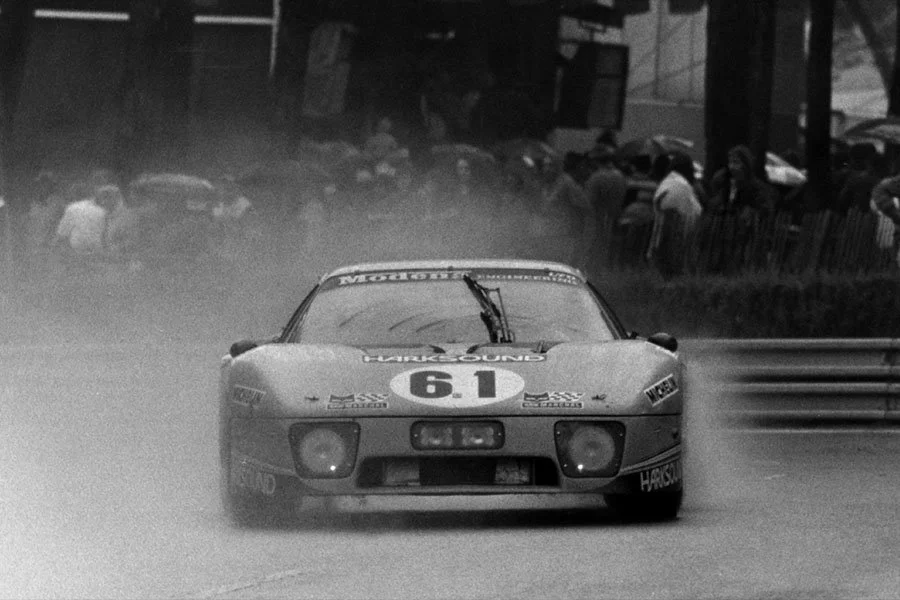All three of the Daytona entries were present at Le Mans in 1979 along with chassis 27577 which was the only new BB LM in attendance. The handsome yellow and black car was driven by Blaton, Nick Faure, Bernard de Dryver and Pink Floyd manager, Steve O’Rourke. It qualified 45th and, despite temporarily stopping out on the circuit with a soaked ignition system during Sunday morning, was the only BB LM to see the chequered flag. Chassis 27577 crossed the line twelfth overall to bag fifth spot in the over 2.5-litre IMSA class.