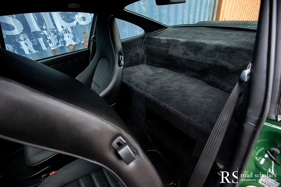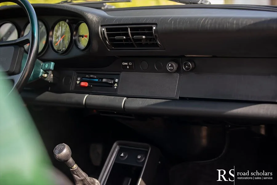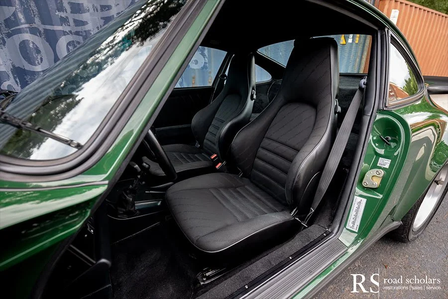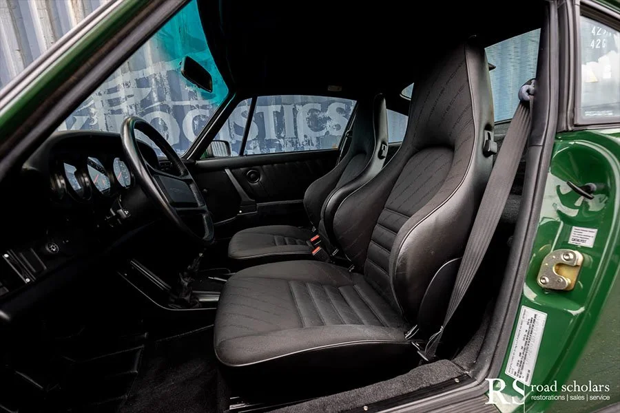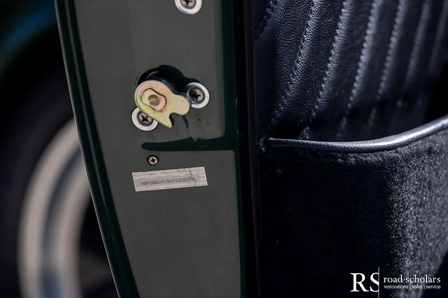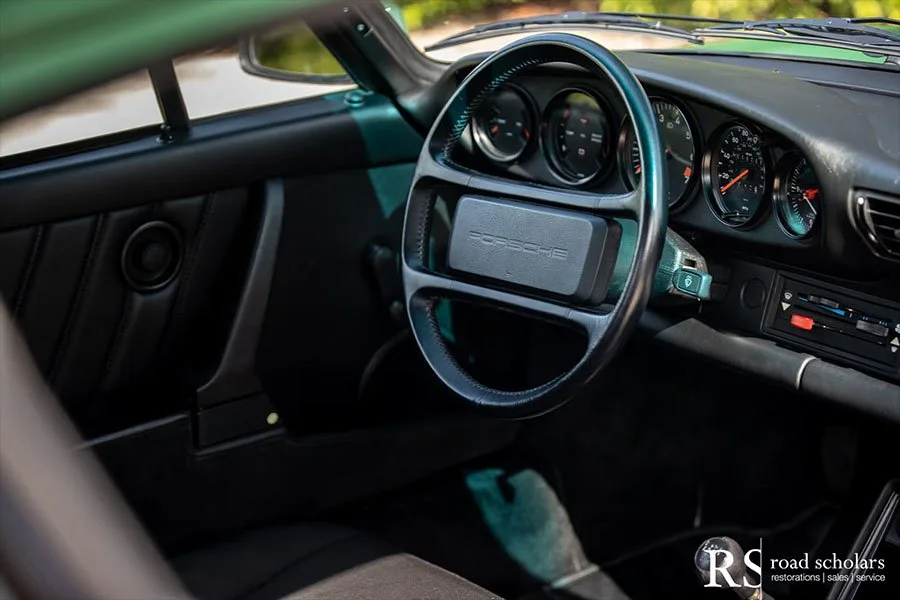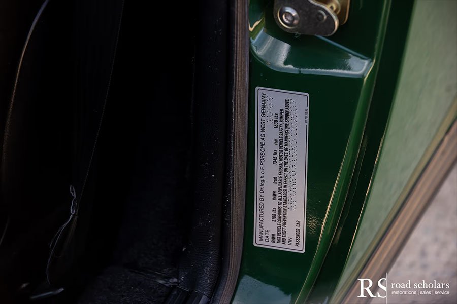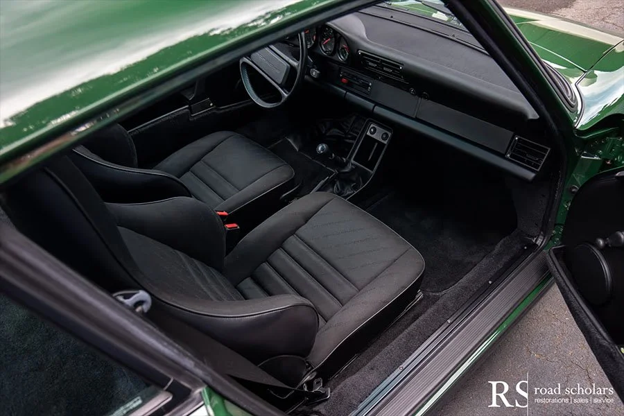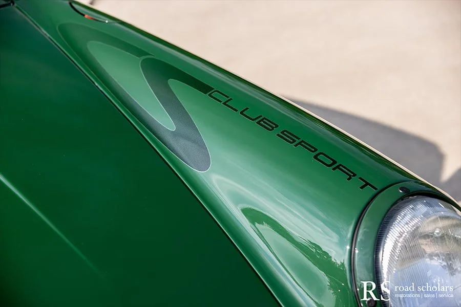 As you can see, this is no ordinary Grand Prix White Club Sport with lurid red highlights. Instead, the first owner opted for rarely seen Irish Green, a non-metallic Paint to Sample shade. The only known Club Sport finished as such, chassis ‘120507’ was further configured with Black Porsche-script fabric upholstery and matching carpet.