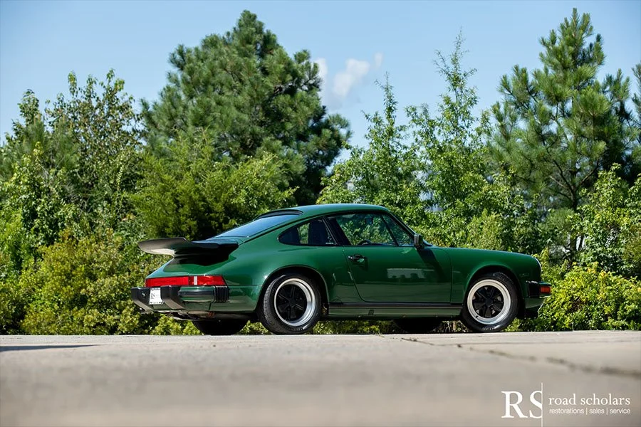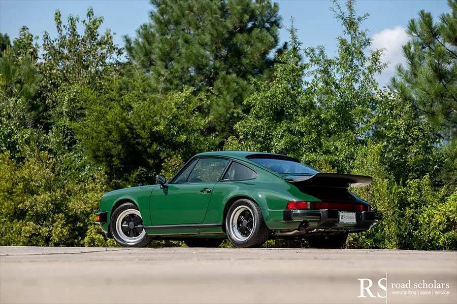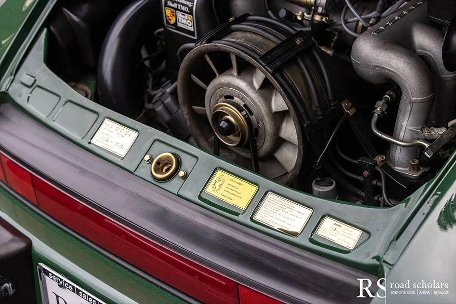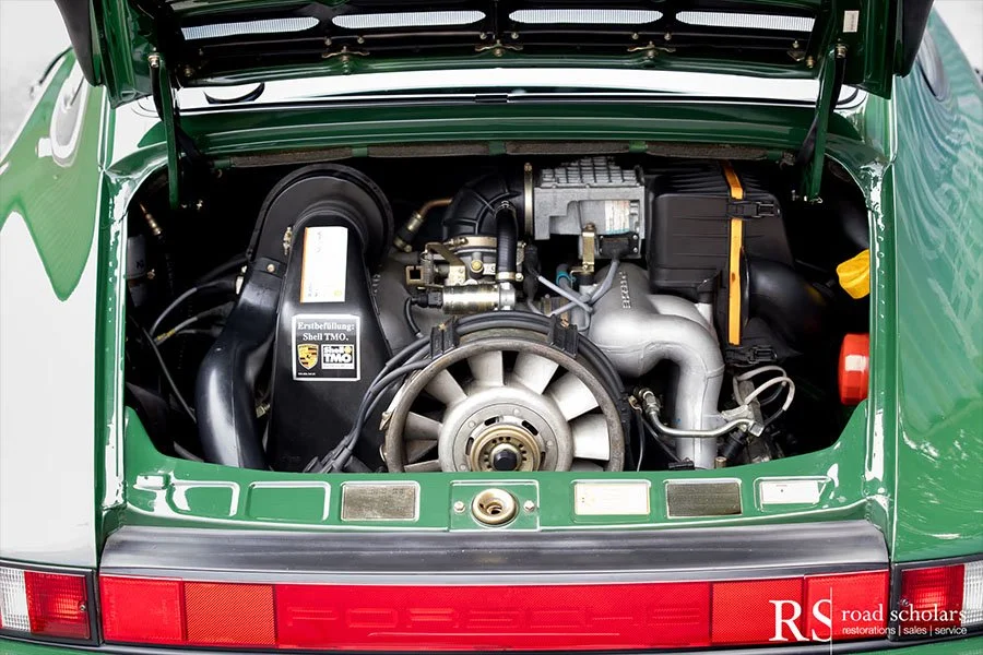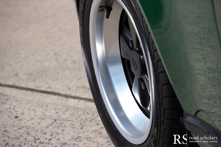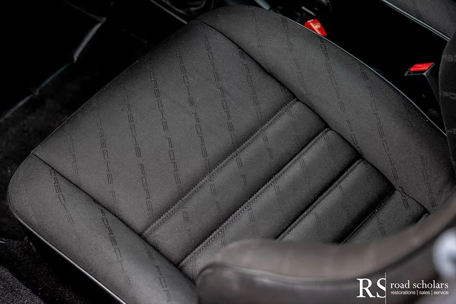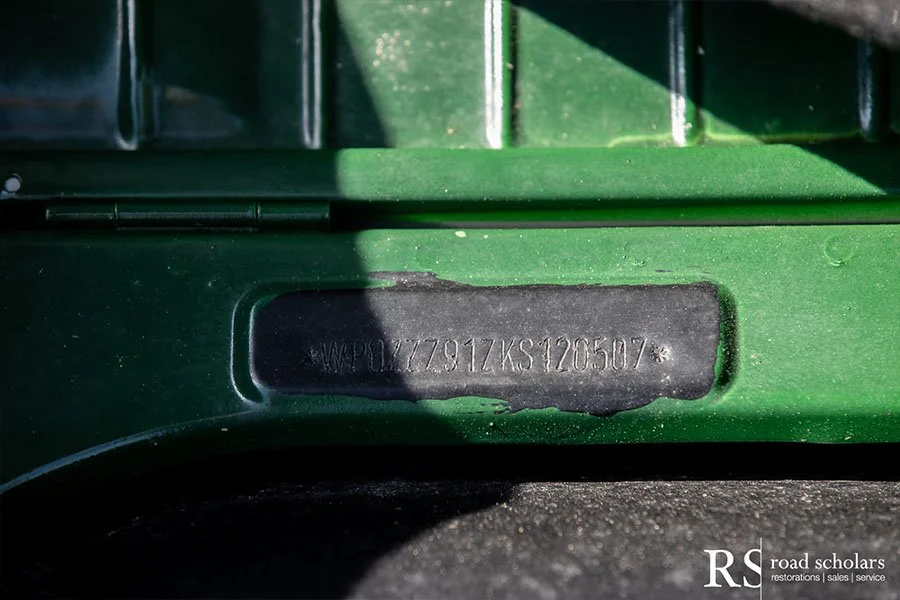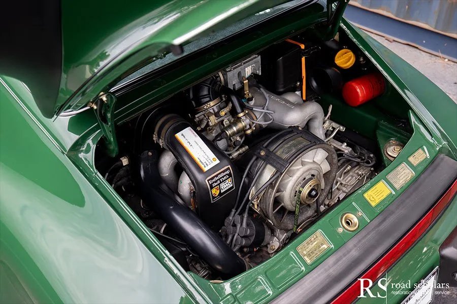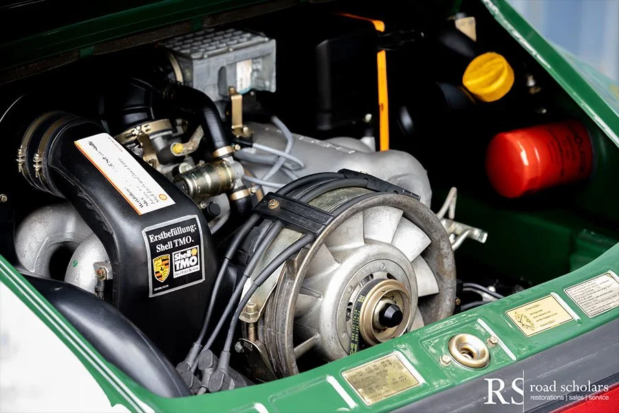 As you can see, this is no ordinary Grand Prix White Club Sport with lurid red highlights. Instead, the first owner opted for rarely seen Irish Green, a non-metallic Paint to Sample shade. The only known Club Sport finished as such, chassis ‘120507’ was further configured with Black Porsche-script fabric upholstery and matching carpet.