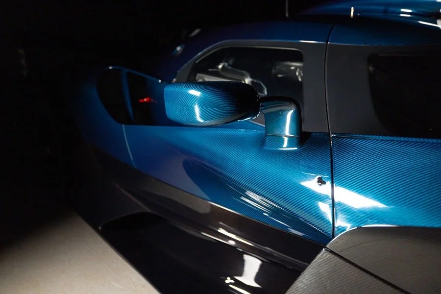 Chassis VF9SX0V08RM795037 was configured by the consigning owner in duo-tone Turquoise Carbon over Black Carbon. The exterior was further personalised by way of discrete French flag motifs on the turning vanes behind each front wheel and a white band for the leading edge of the roof-mounted intake snorkel. Matching white finish was also used for the W16.4 script on the shark fin stabiliser, the EB rear wing endplate logos and the Bugatti script emblazoned on the underside of the rear spoiler.