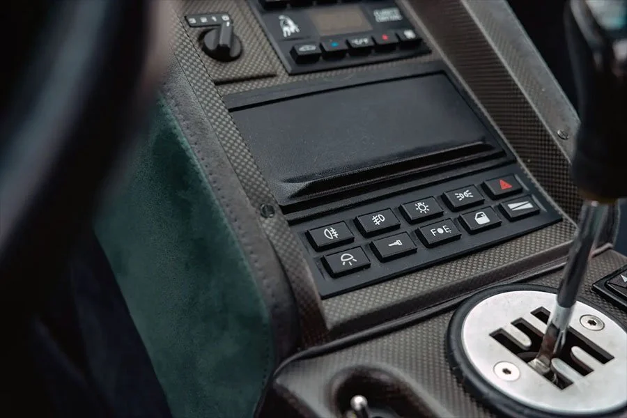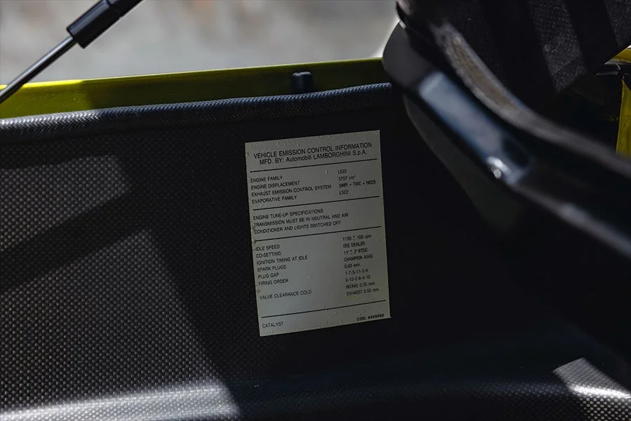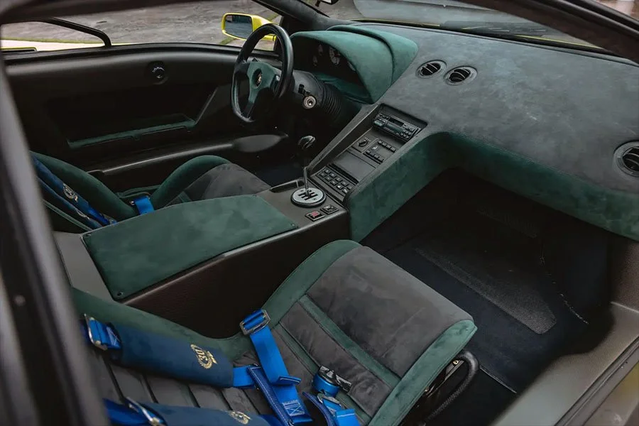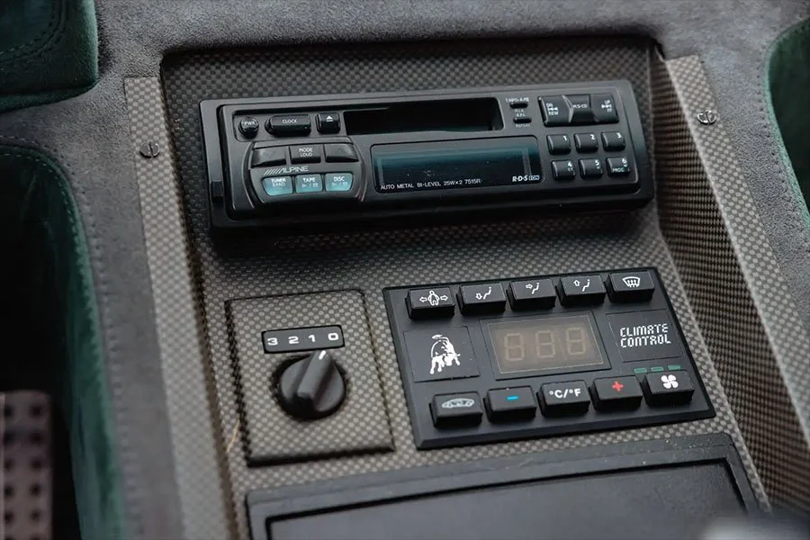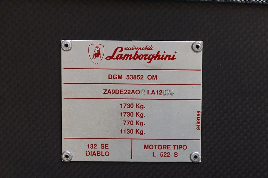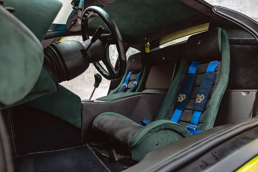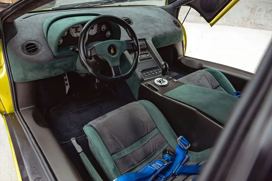 The 76th of 150 SE30s produced, RLA12076 was delivered on November 15th 1994 as the personal car of Lamborghini’s Dutch distributor, Gerrit Bloemendal, whose name adorns the numbered cockpit plaque. In addition to its unusual exterior colour, the SE30 was ordered with two-tone Verde / Grigio alcantara upholstery, four-point harnesses, a fire system and an ashtray.